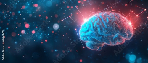 Fototapeta premium Blue Digital Brain on Abstract Background with Light Particles and Connection Lines.