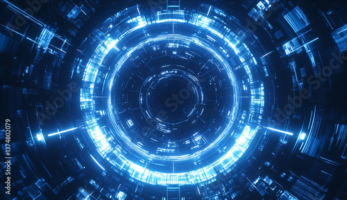 Fototapeta premium "Blue digital vault with bright light circles, technical graphics, and...