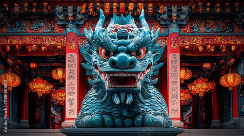 © kinkin, Fototapeta premium Blue dragon statue before Chinese temple.