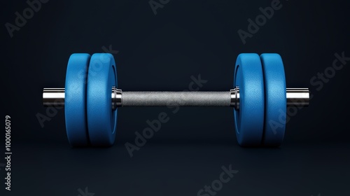 Naklejka premium Blue dumbbell on a dark background, fitness and strength training equipment.