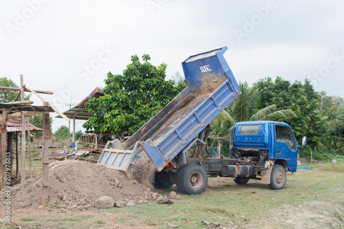 © Achira22, Obraz premium Blue dump truck unloading soil at construction site