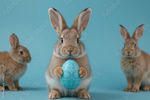 © MetaPixel, Fototapeta premium Blue Easter Egg Held by Bunny Rabbit on a Blue Backdrop