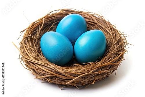 © Oliver, Obraz premium Blue Easter Eggs in Nest on White Background