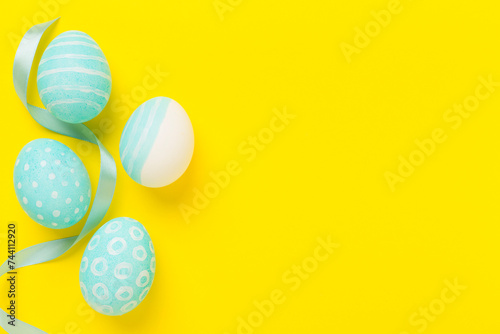 © Liami, Fototapeta premium Blue easter eggs on color background, top view