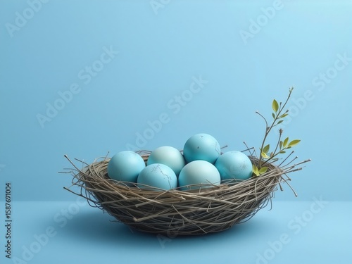 © Yuane, Obraz premium Blue Eggs in Nest on Blue Background
