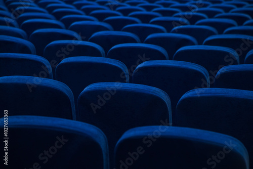 Fototapeta premium Blue empty seats in the audience prepared for the participants of the conference or presentation