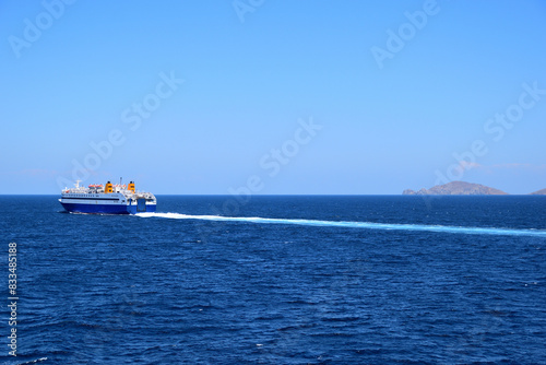 © Constantin, Fototapeta premium blue ferryboat crossing the blue sea - near Lemnos island, Greece, aegean sea