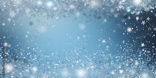Obraz premium Blue festive background with white snowflakes and shiny glitter elements, free copy space for text
