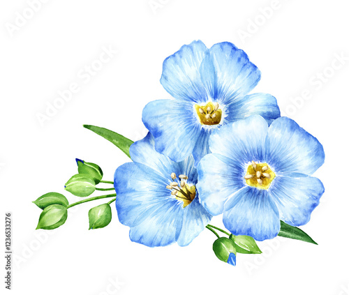 Fototapeta premium Blue flax flowers. Watercolor hand painted illustration isolated on white background