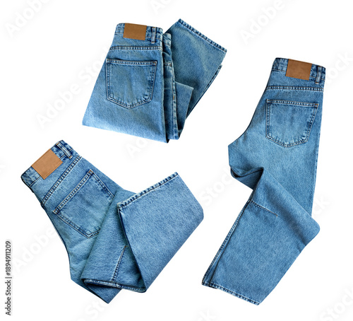 Fototapeta premium Blue folded jeans set isolated on white, collage of trousers, denim cloth...
