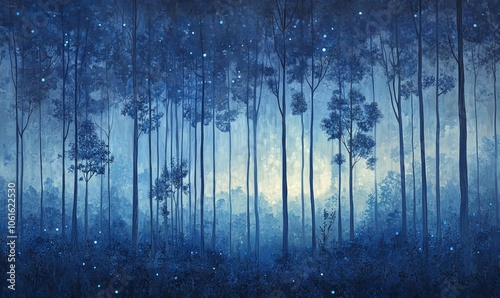© jambulart, Obraz premium Blue forest with glowing lights.