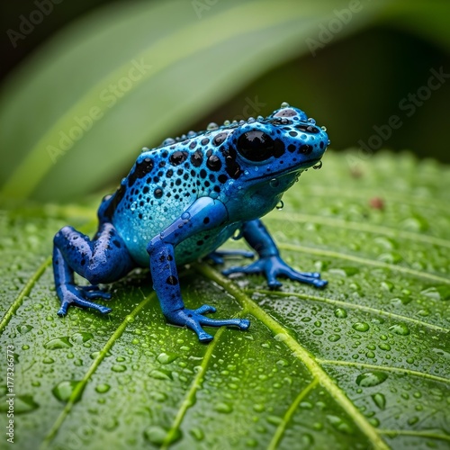 © Joo, Obraz premium Blue frog on a leaf with drops of water