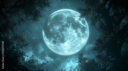 Fototapeta premium Blue full moon rising over dark forest at night