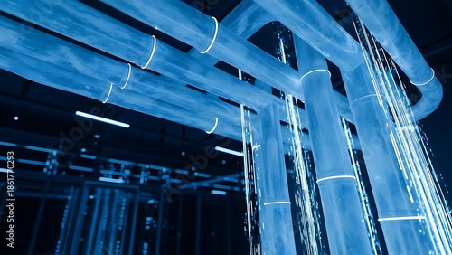 Obraz premium Blue Futuristic Pipes with Flowing Light Streams industrial