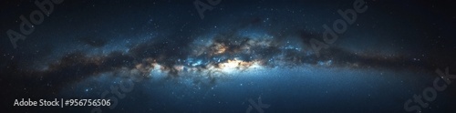 Fototapeta premium Blue galaxy background with stars and nebulae, abstract space panoramic banner