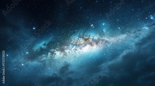 Fototapeta premium Blue galaxy with bright stars and dark cosmic cloud. Outer space nebula and stardust. Scientific background for cosmic exploration.
