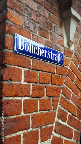 Obraz premium Blue german street sign with white letters indicating Boticherstraße on a red brick wall