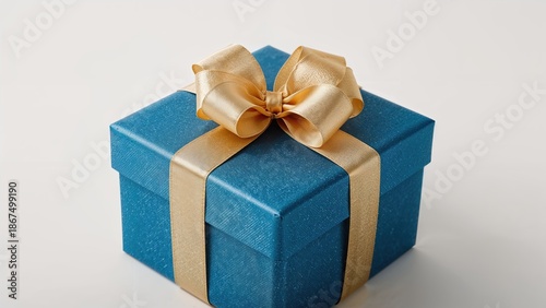 © Lasvu, Obraz premium Blue gift box with a golden ribbon and bow, isolated on a white background.
