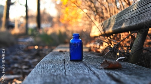 © jinna, Obraz premium Blue Glass Bottle on Rustic Wooden Bench in Autumn Park Setting