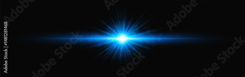 © Vegorus, Naklejka premium Blue glow. Light burst with dynamic rays and flare effect on dark background. Bright beams for technology, space or sci-fi theme. Vector Illustration.