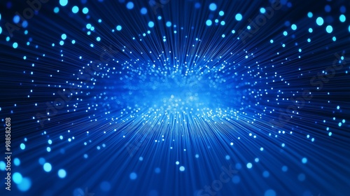 Fototapeta premium Blue glowing fiber optic strands radiating from the center with copy space in...