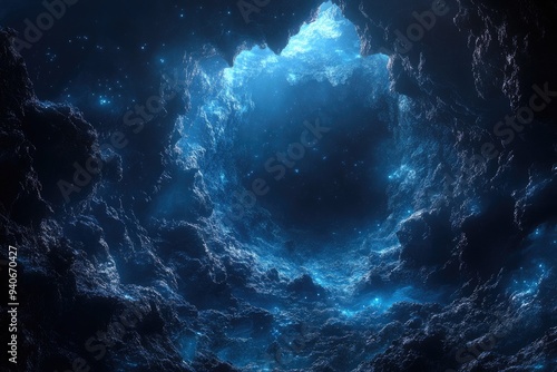 Fototapeta premium Blue Glowing Hole in Rocky Space Landscape