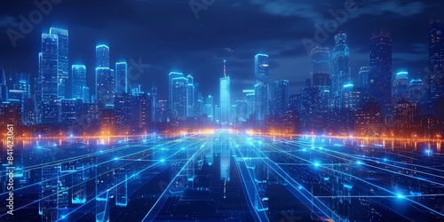 © visoot, Fototapeta premium Blue glowing line drawing of the Cities and streets at night, technology and digital elements in a dark blue background. transparent technology sense. Generative AI.