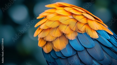 © budiyono, Fototapeta premium Blue-gold macaw feathers, close-up, blurred background, nature