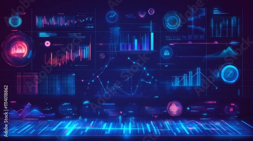 © Glce, Obraz premium Blue gradient background with data science and technology elements, charts, graphs, code lines