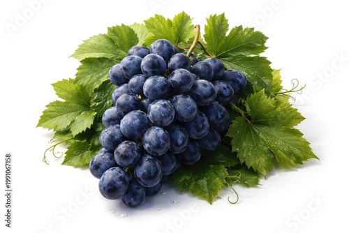 © vxnaghiyev, Fototapeta premium Blue grape bunch surrounded by leafy greens isolated on white backdrop
