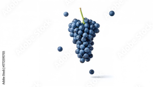 © The 2R Artificiality, Fototapeta premium Blue grapes floating against a white background with berries falling from the cluster. Packaging design element with clipping path.