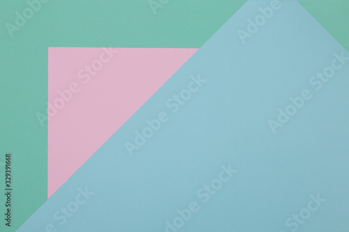 Obraz premium Blue, green and pink background, colored paper geometrically divides into...