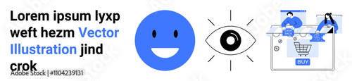 Fototapeta premium Blue happy face, an eye symbol, and two people interacting with a shopping cart interface. Ideal for e-commerce, UIUX design, online shopping, digital marketing, customer experience, visual design