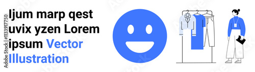 Fototapeta premium Blue happy face beside a clothing rack with various garments and a woman holding a booklet. Ideal for fashion blogs, e-commerce, lifestyle articles, modern design, social media posts, branding