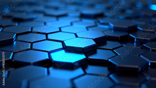 Fototapeta premium Blue hexagonal grid pattern with glowing center, abstract technological surface