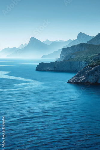 Fototapeta premium Blue horizon featuring a tranquil ocean and minimalist mountain range in the...