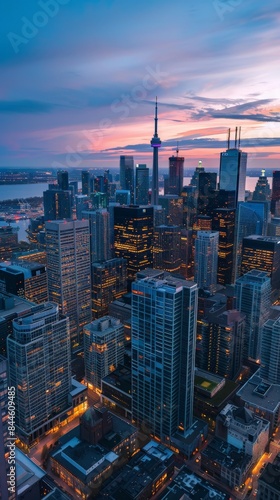 © Yaiza Canvas, Fototapeta premium Blue Hour Aerial Drone Panorama of Downtown City