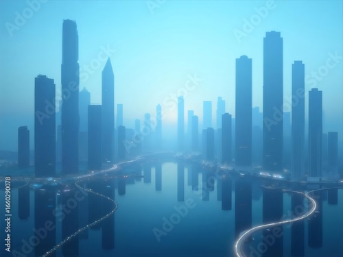 © KidJpeg, Obraz premium Blue Hour Cityscape with Tall Buildings Reflecting in Still Water
