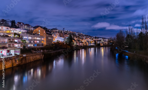 Obraz premium Blue hour in Zürich, the largest city in Switzerland. Illuminated houses along the Limmat River and their reflections in the water