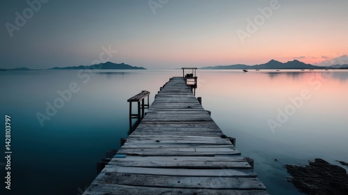 © SnapNest, Obraz premium Blue hour Tropical coastline concept. Serene wooden pier extending into calm waters at sunset, surrounded by distant mountains.