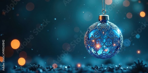 © OneWayPhoto, Fototapeta premium Blue-hued glass and metal Christmas tree ornament with intricate patterns and shapes suspended in mid-air, decorative shapes, metallic ornament