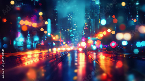 © hugy, Obraz premium Blue Hues and Violet Streaks in a Futuristic Urban Mirage