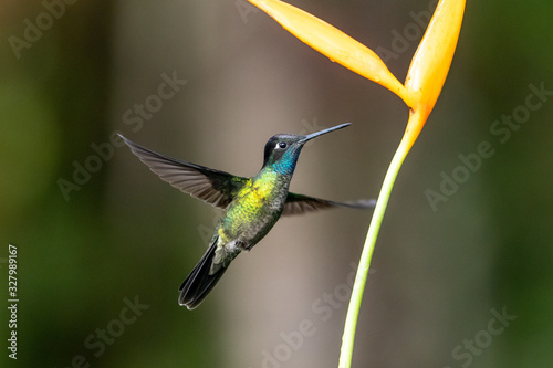 © vaclav, Naklejka premium Blue hummingbird Violet Sabrewing flying next to beautiful red flower. Tinny bird fly in jungle. Wildlife in tropic Costa Rica. Two bird sucking nectar from bloom in the forest. Bird behaviour