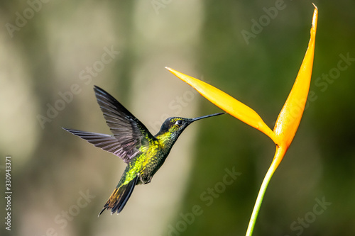 © vaclav, Fototapeta premium Blue hummingbird Violet Sabrewing flying next to beautiful red flower. Tinny bird fly in jungle. Wildlife in tropic Costa Rica. Two bird sucking nectar from bloom in the forest. Bird behaviour