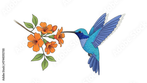 © alfan, Fototapeta premium blue hummingbird with its long beak in an orange trumpet flower, feeding on nectar.