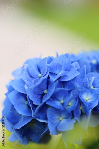 Obraz premium Blue Hydrangea on green garden background.