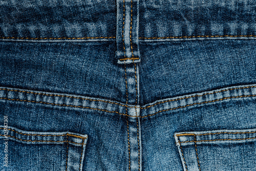 © savelov, Fototapeta premium Blue jeans back pocket with a close-up. Fabric texture high resolution