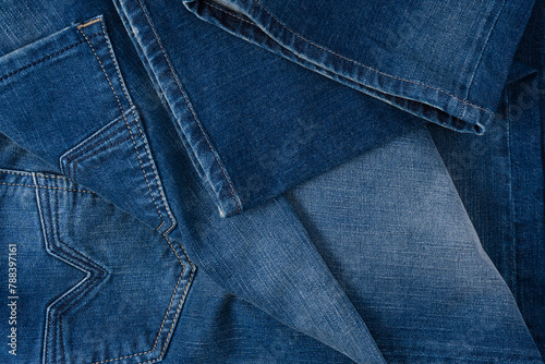 © Nikolay, Fototapeta premium Blue jeans denim texture as a background. Top view.