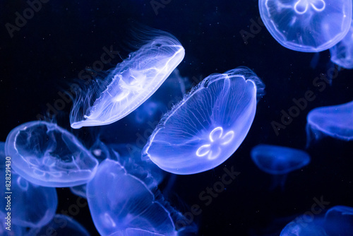 Obraz premium Blue jellyfish swim in the sea on a black background