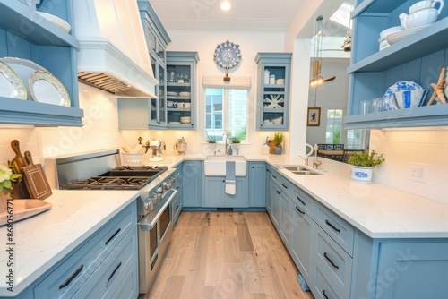 © Elena, Fototapeta premium Blue Kitchen With White Countertops and Farmhouse Sink in a Modern Home